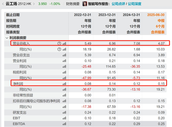 据Wind数据显示,2022-2024年及2025年上半年,云工场营收分别为5.49亿元、6.96亿元、7.08亿元,以及4.07亿元;净利润分别为0.08亿元、0.14亿元、0.12亿元,以及0.15亿元;