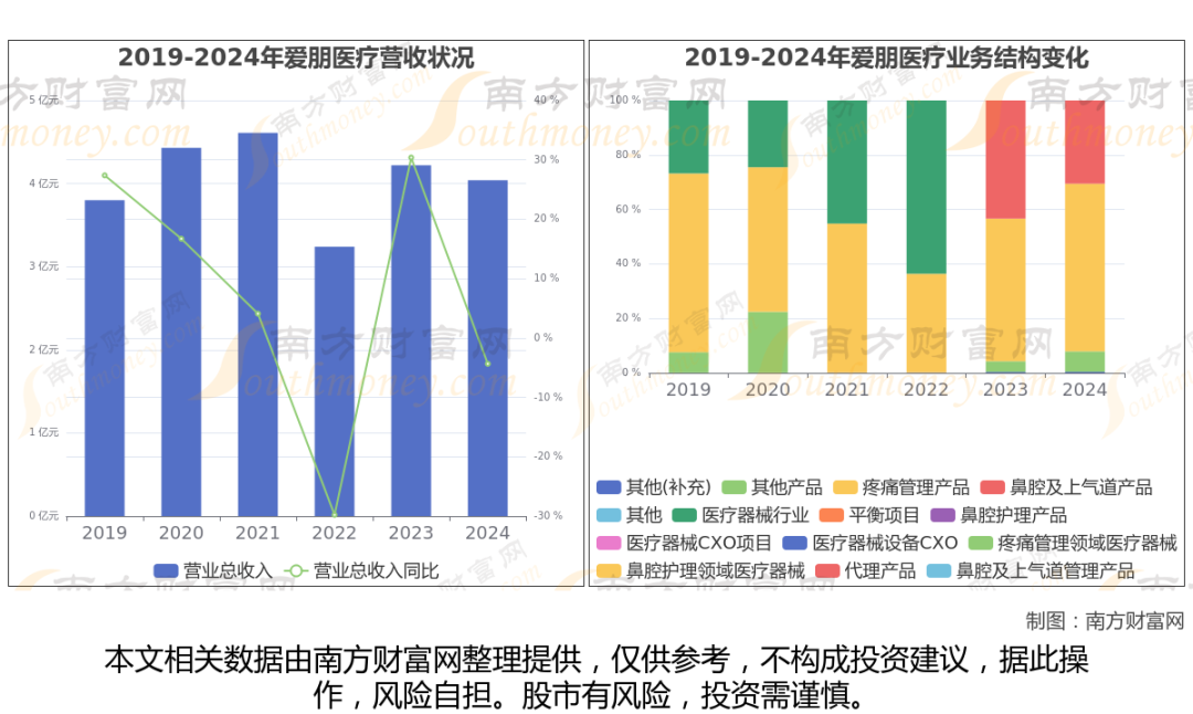 爱朋医疗财务数据显示(如上图): 2024年实现营业总收入 4.04亿,同比增长-4.35%。近五年复合增长率(CAGR)为-2.29%。