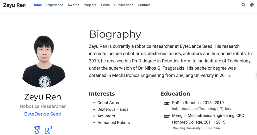 2019年至2020年,他曾在意大利技术研究院出任博士后研究员,2020年4 月-2021年9月,在珞石机器人担任机电工程师;2021年9月至2023年11 ,则是在小米公司出任高级研发工程师。之后,他加入字节Seed。