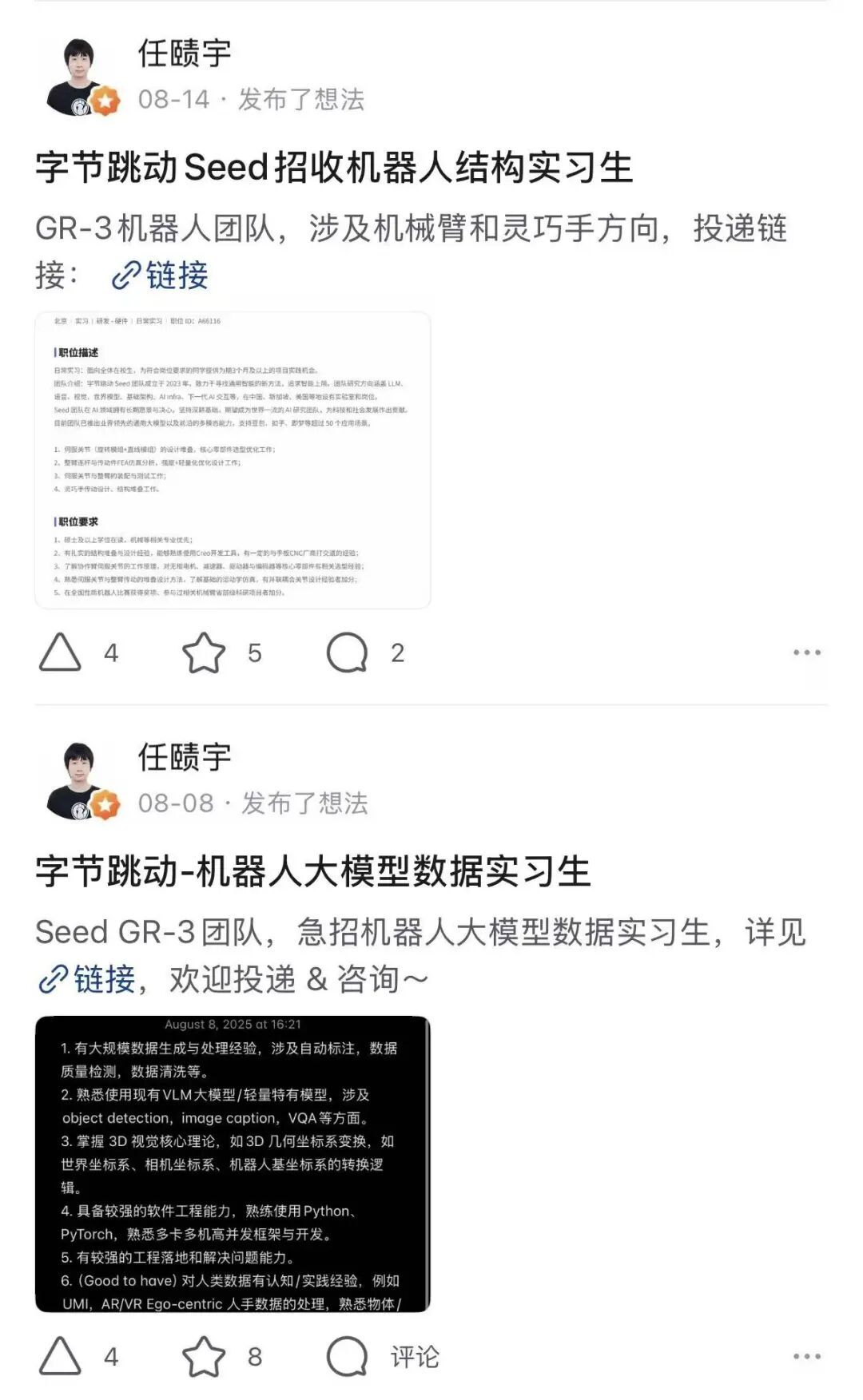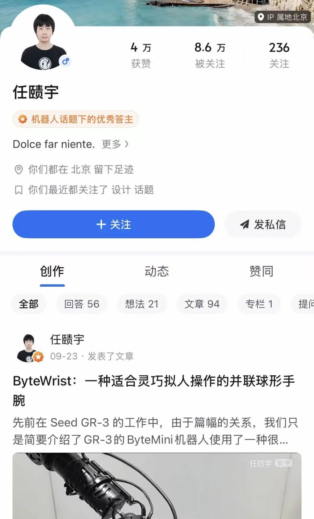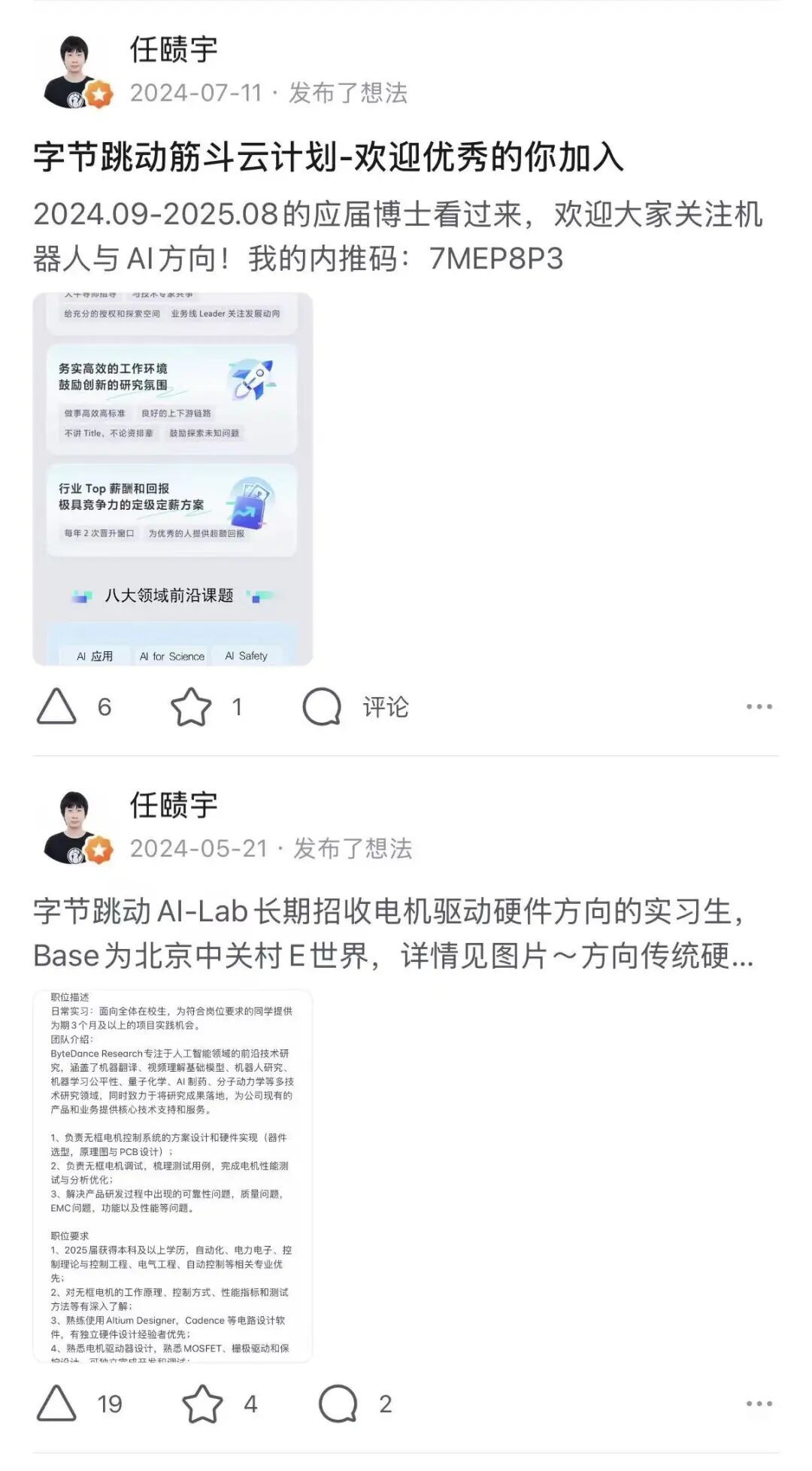 据了解,任赜宇在入职字节跳动前先后加入珞石科技与小米集团,主要科研方向为机器人系统集成。