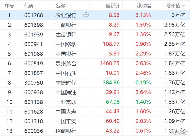 数据显示,A股共有13家万亿市值上市公司,包括农业银行(3万亿元)、工商银行(2.95万亿元)、建设银行(2.53万亿元)、中国移动(2.35万亿)、中国银行(1.87万亿)、贵州茅台(1.84万亿元)等。