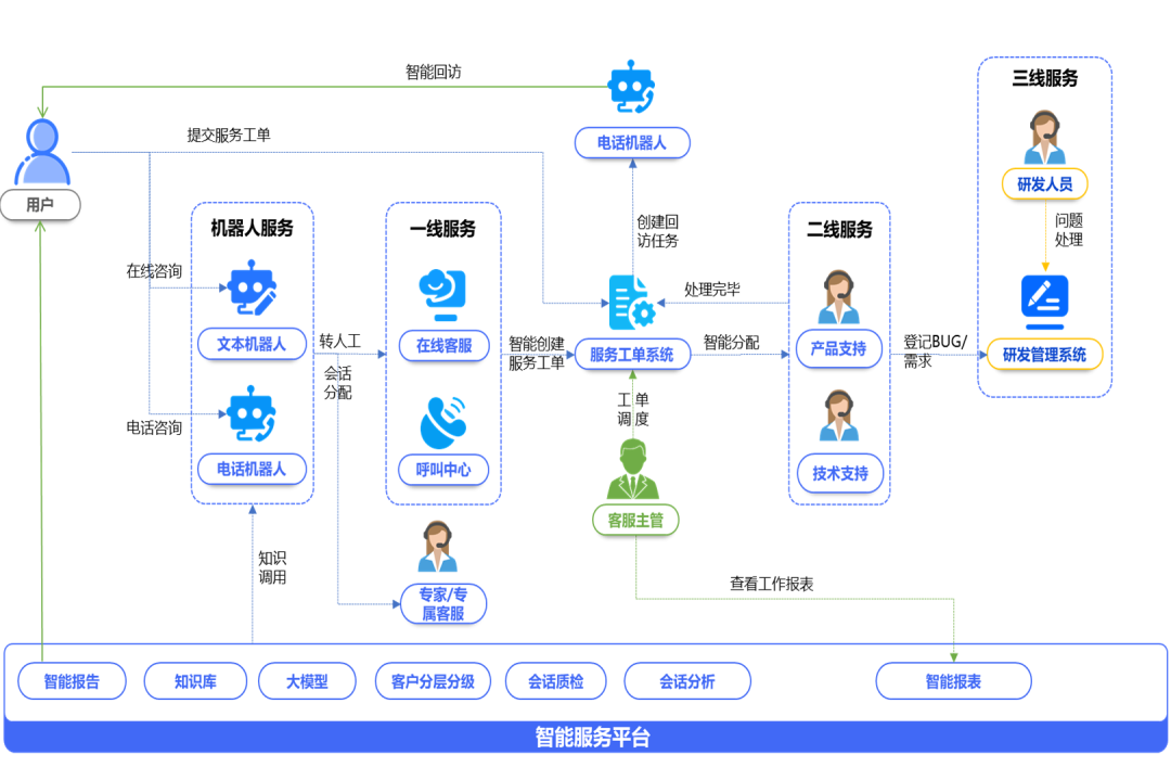 基于 AI 算法自动识别工单紧急程度与影响范围,动态匹配处理优先级(P1-P4)。超时未响应工单自动触发升级机制,确保问题高效闭环。同时,该系统与研发体系无缝对接,实现问题类型(如功能缺陷、配置故障)的自动分派。