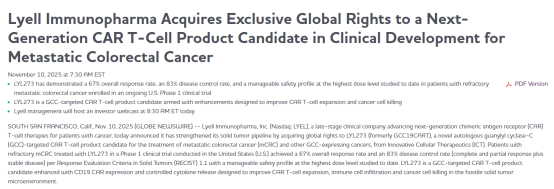 11月10日,Lyell Immunopharma宣布,已获得斯丹赛生物开发的LYL273(前身为GCC19CART)在大中华区以外的全球权利,进一步强化其在实体瘤CAR-T领域的研发布局。