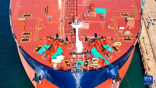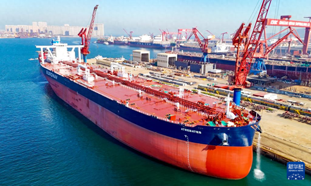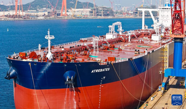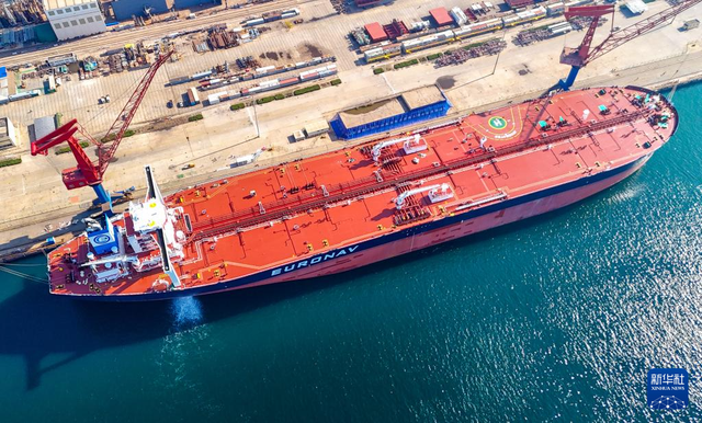 11月10日,氨预留超大型原油船在青岛西海岸新区交付(无人机照片)。 11月10日,中船北海造船在山东青岛西海岸新区向比利时船东交付31.9万吨氨预留超大型原油船。 新华社发(张进刚摄)