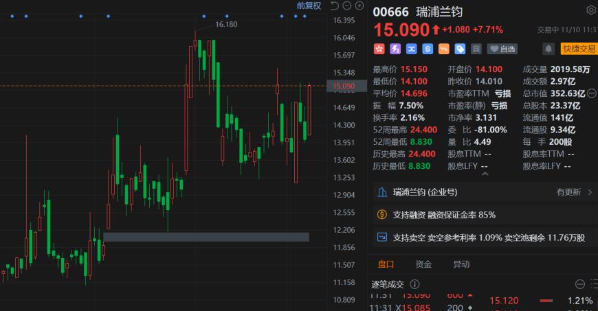 11月10日,瑞浦兰钧(0666.HK)大幅拉升涨至8%,现报15.09港元,总市值352.6亿港元。