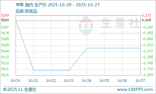 据生意社商品行情分析系统显示,2025年11月3日至11月10日甲苯市场震荡上行。11月3日甲苯基准价在5150元/吨,11月10日甲苯基准价在5240元/吨,涨1.75%。本周期国内甲苯市场震荡上涨。山东地区主营炼厂出厂价格普遍上调,下游化工及调油行业需求整体依旧偏稳,采购偏刚需。华东及华南市场价格小幅上调,市场商谈气氛尚可,综合来看甲苯市场本周稳中偏强运行为主。