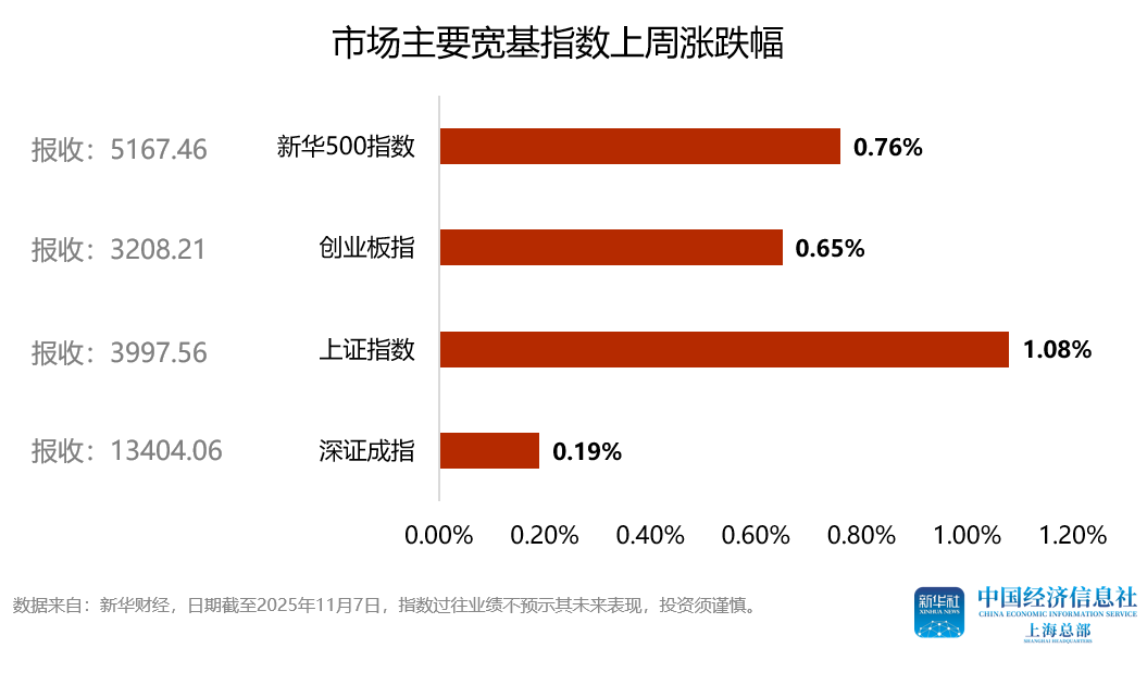 上周A股市场主要宽基指数齐齐上涨。其中,上证指数周度上涨1.08%;深证成指周度上涨0.19%;创业板指周度上涨0.65%;新华500指数周度上涨0.76%。