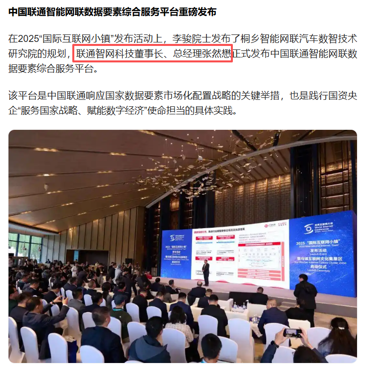 经过查询公开信息,赵越最后一次以联通智网科技股份有限公司董事长的身份出席活动是在今年4月的上海国际汽车工业展览会上,而在11月9日的世界互联网大会乌镇峰会中,张然懋已经以联通智网科技董事长、总经理的身份发表讲话。