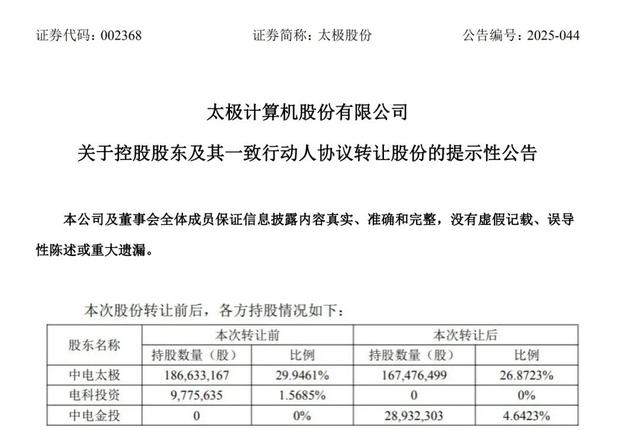 中电太极拟向中电金投转让持有的太极股份1915.67万股股份,占上市公司总股本的3.0738%;电科投资拟向中电金投转让持有的太极股份977.56万股股份,占上市公司总股本的1.5685%。