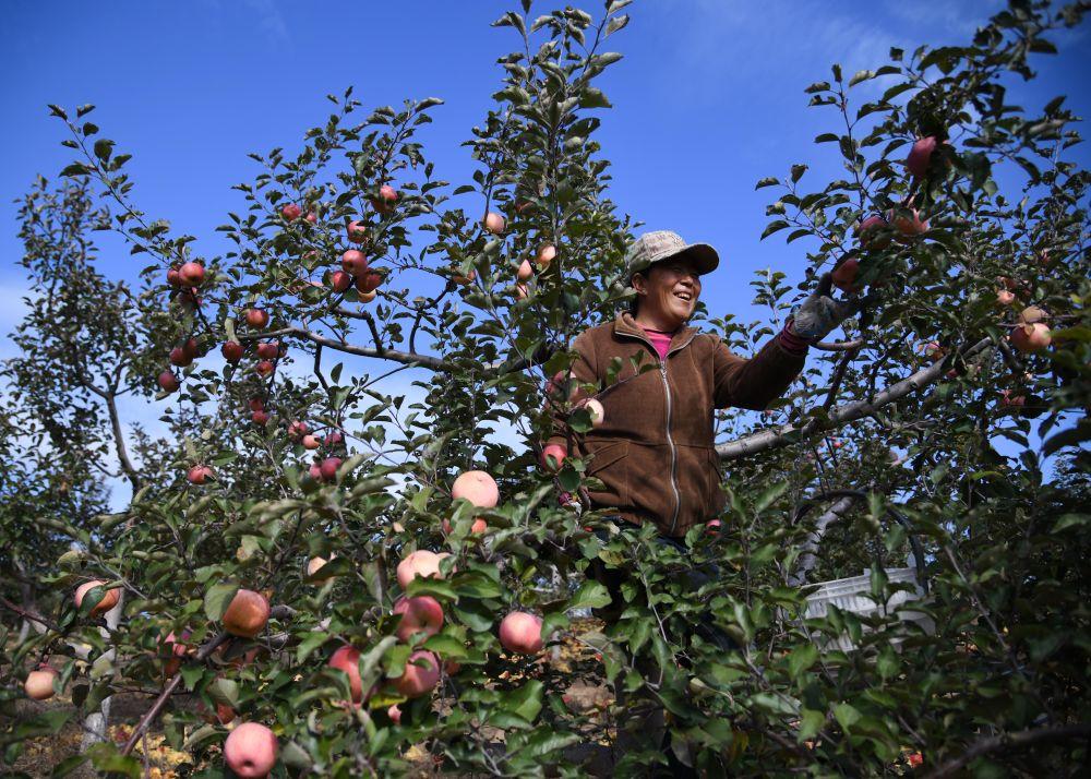 11月4日,果农在陕西省榆林市横山区赵石畔镇一处果园采收苹果。新华社记者张博文 摄榆林北端的神木市,曾是“十种九不收”的典型。近十年来,当地发展山地苹果近8000亩。贺家川镇900亩苹果园里,负责人王明伟笑着说:“今年苹果产量将突破30万斤。”