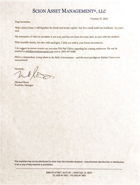与此同时,一封署名伯里、日期为10月27日的投资者信截图在社交媒体平台X上流传,引发广泛关注。信件显示,伯里计划在年底前清算旗下基金并返还投资者本金。