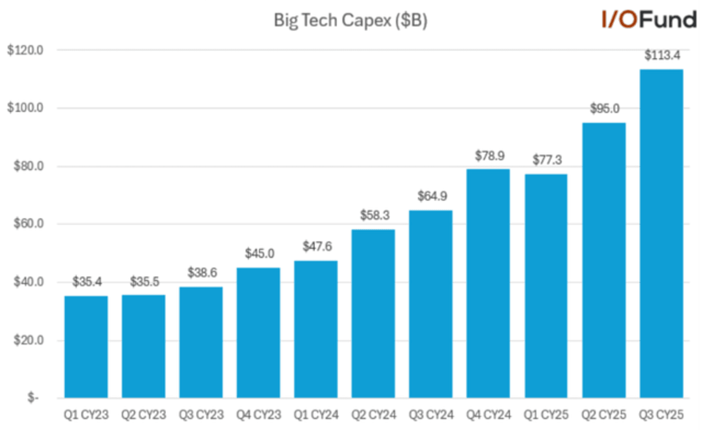 I/O Fund给出了一组数据,把微软、谷歌、亚马逊、Meta等几家大厂未来几年的CapEx预算加在一起:未来几年Big Tech在“AI基础设施(GPU、CPU、数据中心、电力)上计划投入约4050亿美金”,单微软2025财年的CapEx就同比增长了58%,达到882亿美金,而且管理层已经提示2026财年增长率还会更高。