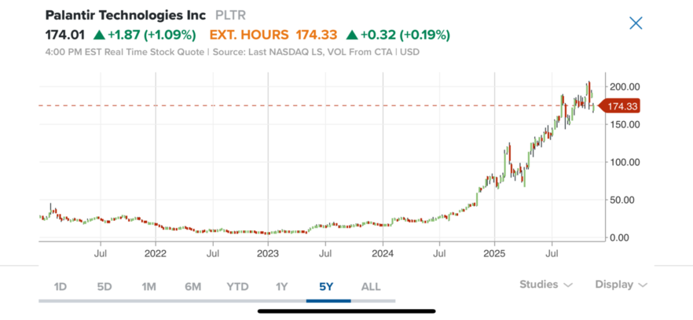 今年以来,PLTR股价涨幅在135%–150%区间,自2022年低点算起接近20倍。