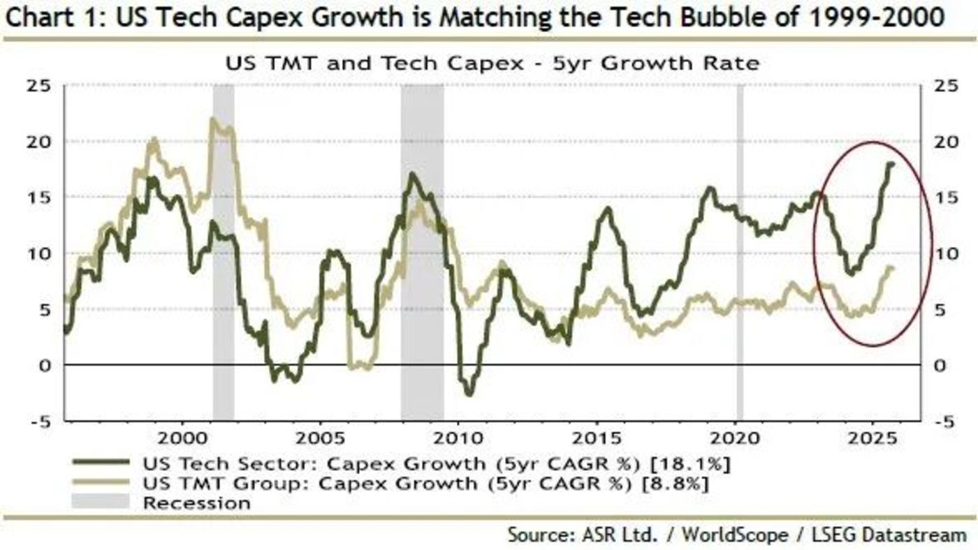 宏观方面,美股科技公司的资本支出,跟1999年互联网泡沫极其相似。标普500指数涨幅七成以上被少数AI股贡献。