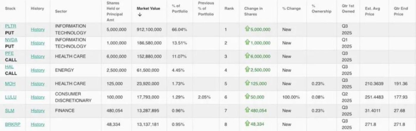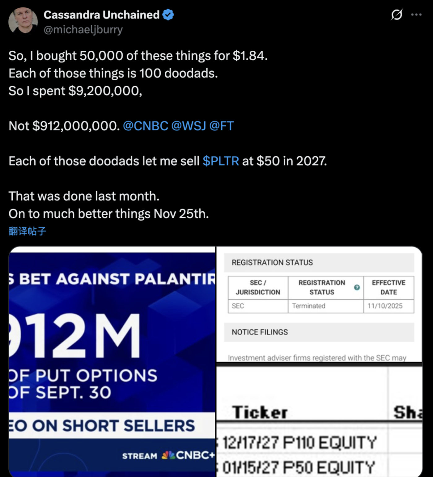 另一边,“大空头”迈克·巴里在最新13F里亮出自己的新下注:买了5万张Palantir的看跌期权,行权价50美金,2027年1月15日到期,期权成本1.84美金,总共掏了大概920万美金,对应名义敞口9亿多。