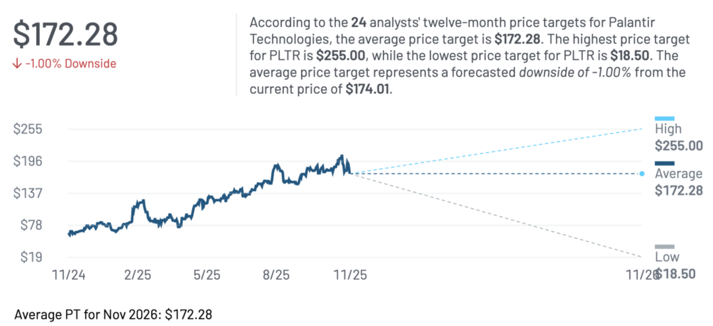 一方面,它没有自己的模型,却站在模型之上做操作系统,政府+企业两头吃,踏实落地;另一方面,它的股价表现、估值水平、分析师分歧,又是这一轮AI情绪的缩影:多头觉得它代表的是“AI基建软件层里的长期赢家”,空头觉得它代表的是“在真正回到现金流折现之前,市场愿意预支的那一部分热情”。