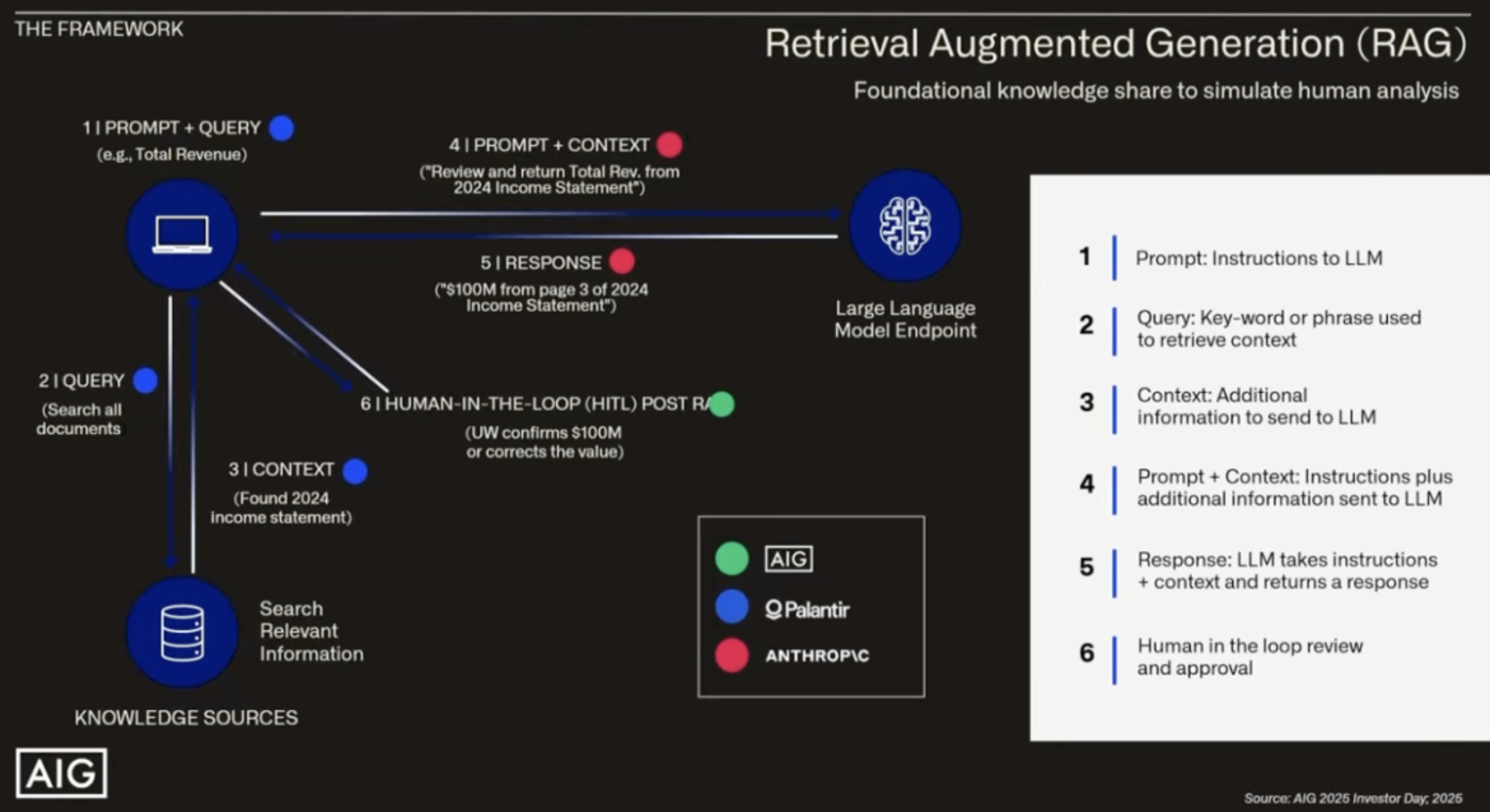 AIG的故事类似,只是换成了核保。AIG搭了一套生成式AI核保助手,底层用的是Claude这类大模型,调度和业务流程那一层交给Palantir来做,据他们自己的说法,核保效率提升了3–5倍,准确率从大约70%提升到了90%左右,关键是全链路可审计。