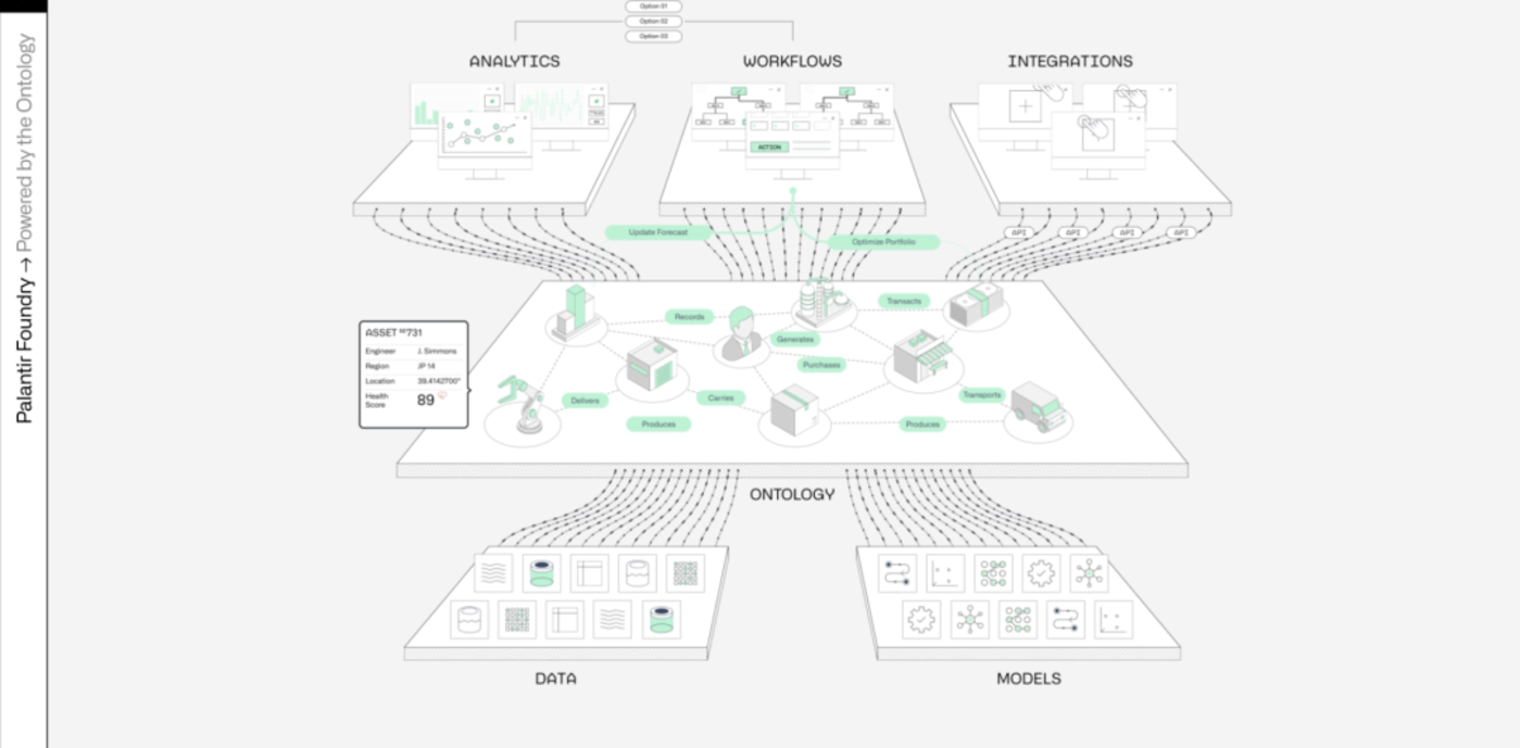 Foundry:企业版Gotham。大客户里有空客、BP、R1 RCM、能源公司等,它做的是把企业内部所有核心系统的数据打通,建立一个统一的数字孪生——生产、供应链、财务、人力、IoT全部进一个本体模型里。