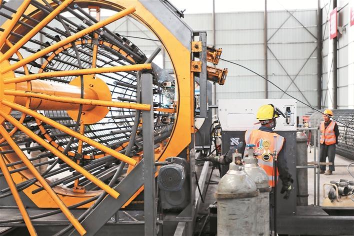 兵团西山新区—乌鲁木齐东二环(G312)段公路项目现场,工人们操作数控钢筋笼滚焊机进行高效精准焊接(资料图片)。张明娟 摄