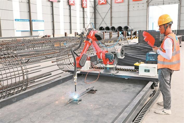 兵团西山新区—乌鲁木齐东二环(G312段)公路项目钢筋加工厂内,机器人手臂正在焊接盖梁骨架片(资料图片)。 张明娟 摄