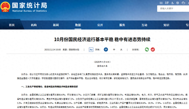 工业生产持续增长,新动能表现亮眼。10月份,全国规模以上工业增加值同比增长4.9%。其中,装备制造业和高技术制造业增势尤为突出,增加值同比分别增长8.0%和7.2%。新能源汽车、工业机器人、3D打印设备等新产品产量同比分别增长19.3%、17.9%和30.8%,彰显了产业升级的强劲动力。