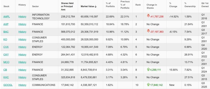三季度伯克希尔的十大重仓股分别是:苹果(AAPL);美国运通(AXP);美银(BAC);可口可乐(KO);雪佛龙(CVX);西方石油(OXY),排名从第七升至第六;穆迪(MCO),排名从第六降至第七;瑞士安达保险(CB),排名从第九升至第八;卡夫亨氏(KHC),排名从第八降至第九;谷歌(GOOGL)。
