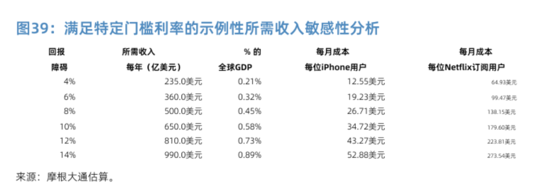 如果要实现10%的合理投资回报率,未来每年AI行业可能需要创造约6500亿美元收入,相当于全球GDP的近0.6%。