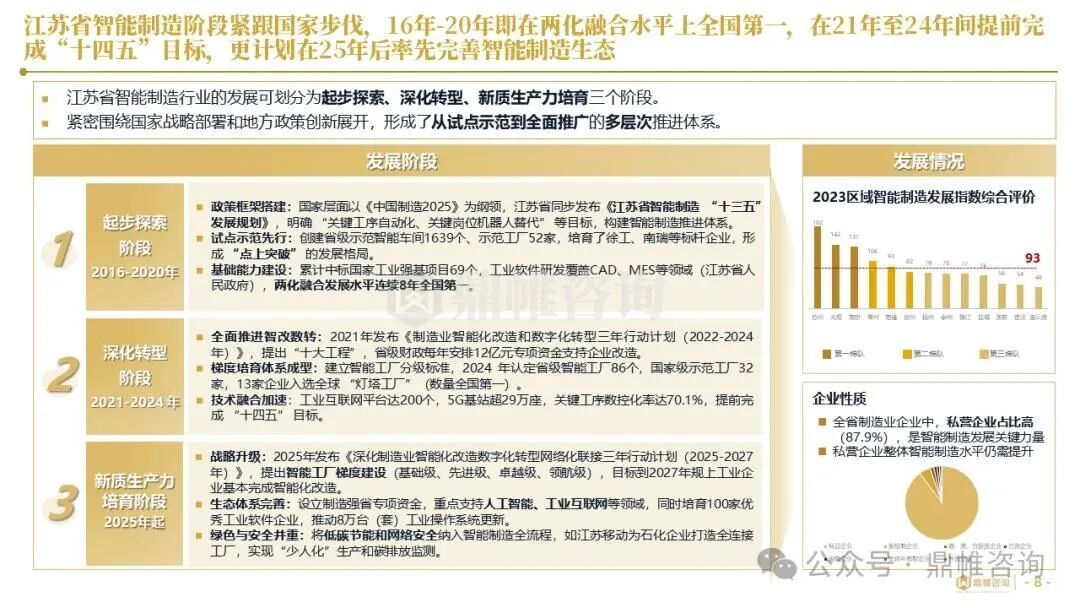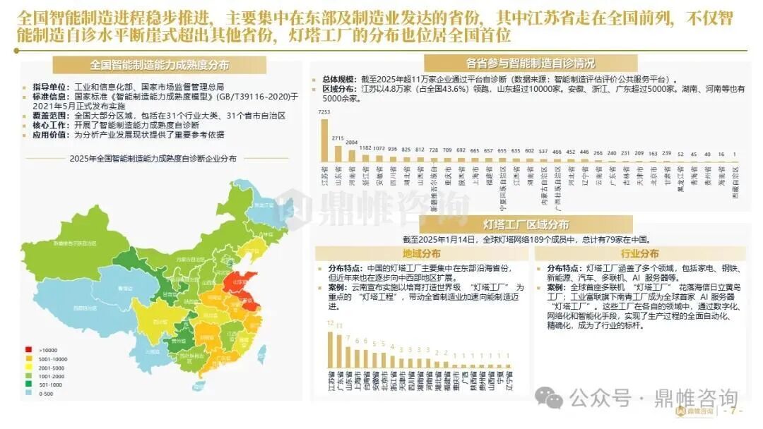 国家政策一直在推动智能制造升级,2025 年重点支持人工智能和制造业融合。江苏在这方面走在前面,智能制造自诊企业占比超 43%,灯塔工厂数量最多。
