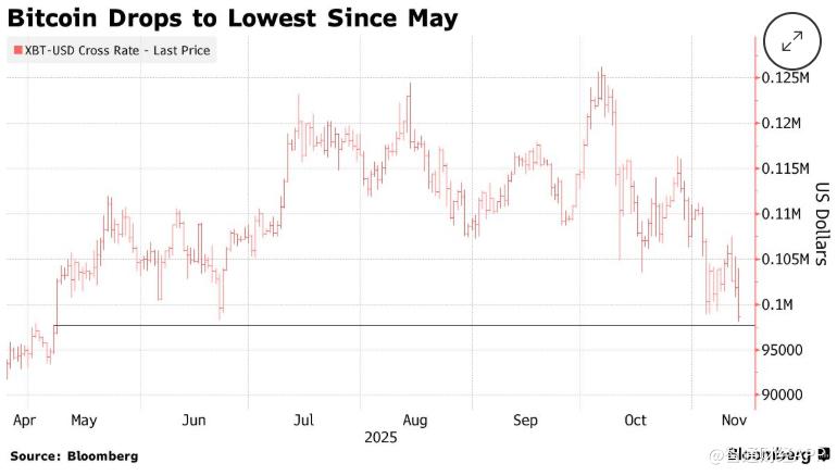 11月14日,比特币周四再一次跌破10万美元关口,在华尔街风险情绪恶化、科技股遭大幅抛售的背景下大幅走弱。比特币盘中一度下跌3.9%,触及97,956美元。自10月初以来已累计蒸发逾4,500亿美元市值,而今年以来为比特币提供支撑的大型基金、ETF配置机构与企业金库等关键买盘纷纷退潮,使本轮行情快速转向脆弱。