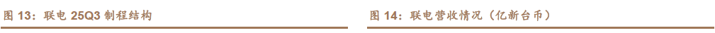 联电 25Q3 营收 591.3 亿新台币,同比下滑 2.2%、环比增长 0.6%;毛利率为 29.8%;产能利用率 78%,相较 2025Q2 提升 2.0pcts。从制程来看,联电22/28nm 的营收占比为 40%,40nm/65nm 营收占比分别为 15%/17%。联电 25Q3的总产能达到 130.5 万片等效 12 寸,预计全年资本开支为 18 亿美元。