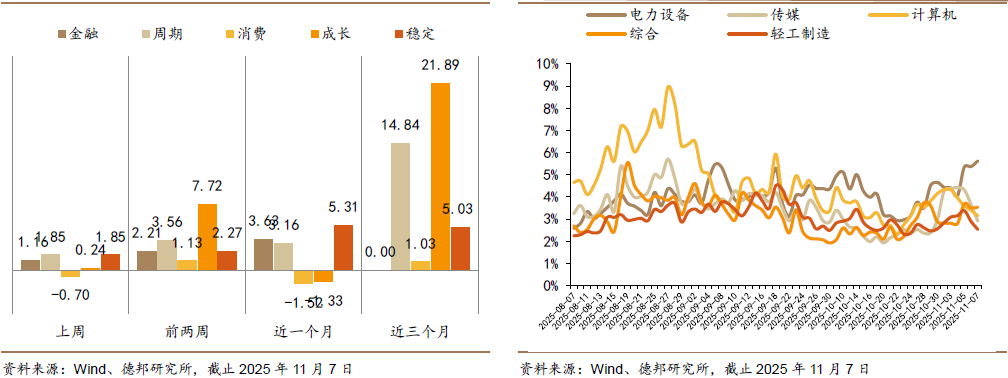大宗商品方面:本周大宗商品普遍回调,黄金表现相对坚挺。截止 11 月 7 日,COMEX 黄金期货结算价 4007.8 美元/盎司,周度跌幅 0.1%。本周波罗的海干散货指数(BDI)周度涨幅 7.0%,近一个月跌幅 1.4%。