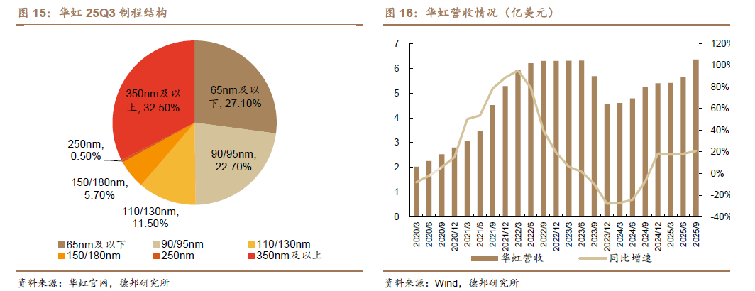 华虹 25Q3 营收 6.4 亿美元,同比增长 20.7%、环比增长 12.2%,位于先前指引 6.2-6.4 亿美元的上线;毛利率为 13.5%,高于先前指引的 10%-12%;产能利用率 109.5%,相较 2025Q2 提升 1.2pcts。从制程来看,华虹 65nm 及以下营收占比为 27%,90nm/95nm 营收占比分别为 23%。华虹 25Q3 的总产能达到 46.8万片等效 8 寸,Q3 资本开支为 2.6 亿美元。公司预计 25Q4 营收 6.5-6.6 亿美元,毛利率为 12%-14%。