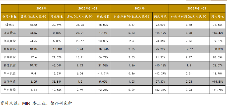 从企业表现来看,2025 年 Q3 头部国产厂商整体表现稳健。创世纪海天精工纽威数控乔锋智能等企业营业收入普遍实现增长。其中,乔锋智能与国盛智科增速突出,分别同比增长 56.71%和 21.53%;创世纪则以 38.26 亿元的营业收入稳居行业首位。纽威数控、浙江德曼等企业的营收增速亦显著高于行业平均水平,反映出其在新兴应用领域的竞争优势正在强化。