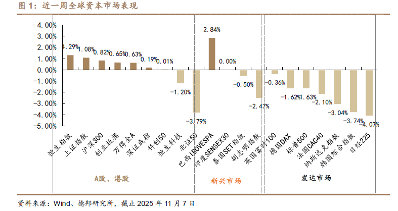 海外市场方面:美国政府持续停摆,美联储内部对 12 月降息分歧有所上升,本周美股三大指数全面回调,标普 500 指数下跌 1.63%、纳斯达克综合指数下跌3.04%、道琼斯工业指数下跌 1.21%。欧洲市场方面,本周英国富时 100 下跌0.36%、德国 DAX 下跌 1.62%、法国 CAC40 下跌 2.10%。新兴市场表现分化,胡志明指数下跌 2.47%、泰国 SET 指数下跌 0.50%、巴西 IBOVESPA 指数上涨2.84%。