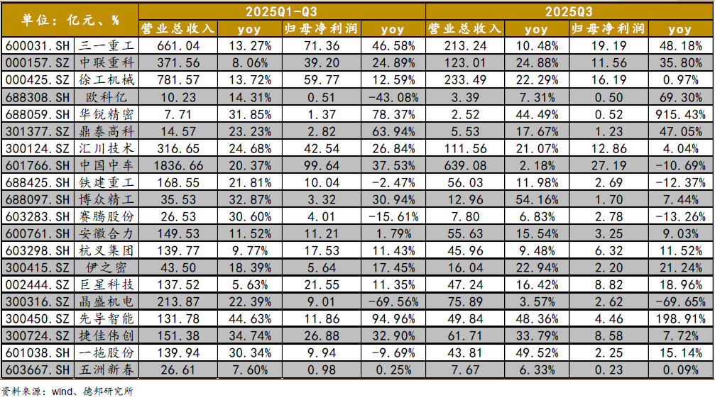 三季度高端制造板块整体延续了“收入改善、盈利分化”的格局。从营收端看,多数企业保持正增长,说明下游装备更新、产业升级和部分新兴需求仍在支撑景气度,工程装备、工业自动化、轨交等方向韧性较强,龙头企业凭借订单与渠道优势仍能实现规模扩张。但从利润端看,表现就不完全一致了:部分企业归母净利润增速好于收入,反映出成本管控、产品结构优化正在见效;也有个别企业利润增速明显低于收入,甚至出现同比下滑,主要与高基数、订单结构变化以及阶段性费用投入等因素有关,说明盈利修复仍是当前行业的核心约束。