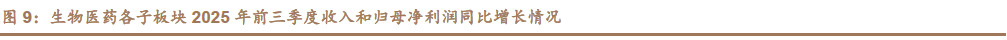 生物医药 15 个细分子版块中,医疗研发外包(CXO),其他生物制品、其他医疗服务板块 2025 前三季度保持收入同比正增长,其中 CXO 恢复最明显。其余板块受到集采、支付政策、行业周期等影响,业绩受到影响。