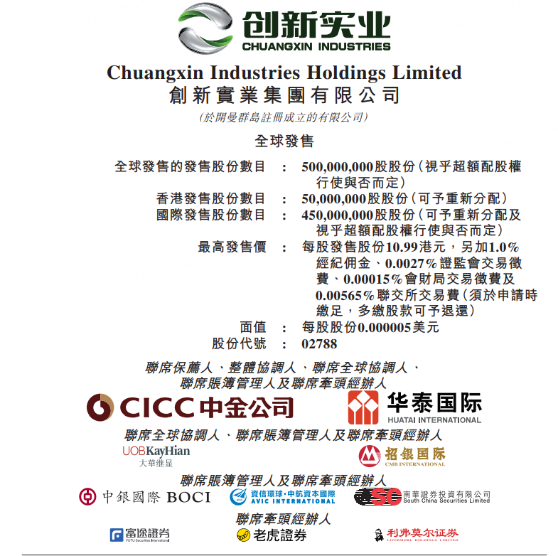 11月14日,创新实业于11月14日至11月19日招股,拟全球发售5.00亿股股份,其中香港发售股份5000.00万股,国际发售股份4.50亿股,另有7500.00万股超额配股权。每股最高发售价10.99港元,每手买卖单位500股,入场费约5550.42港元,预期将于11月24日上市。