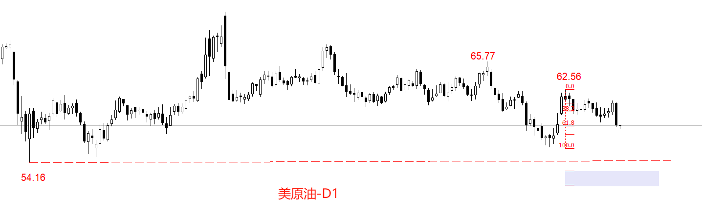 技术角度看,今年4月9日以来,美原油一直在支撑位54.16美元上方震荡,最高价曾达到71.47美元。目前行情处于震荡区间内向下限移动的过程中,昨日的长阴线起到了加速下跌的作用。黄金分割角度看,本轮下跌的目标价位在51~53美元之间,需要做好54.16支撑位被触及的准备。