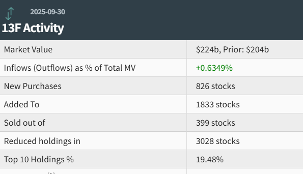 统计数据显示,花旗第三季度持仓总市值达到约2240亿美元,上一季度持仓总市值则约为2040亿美元,市值环比增长约10%。数据显示,花旗在第三季度的持仓组合中新增了826只个股,增持了1833只个股。同时,该金融巨头减持3028只个股,清仓399只个股。其中,前十大持仓标的占花旗美股总市值的19.48%,反映出花旗前十大持仓的总计权重相对较高。