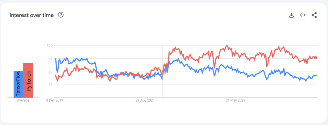 到2021年,TensorFlow在谷歌上的搜索量都高于PyTorch。然而,现在PyTorch已经反超,搜索量几乎是TensorFlow的1.8倍。