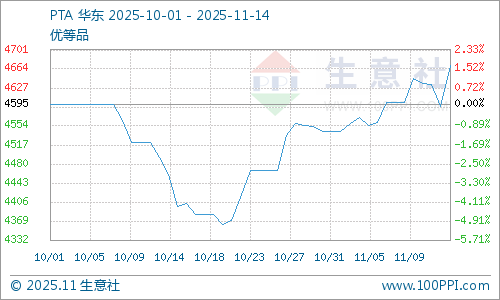 本周国内PTA市场行情呈现先跌后涨态势,截止11月14日国内华东地区PTA现货价格在4671元/吨,较周初上涨0.55%。供应方面,四川能投停车检修,福海创负荷调整,其余装置变化不大,国内整体产量小幅缩量,行业开工率在76%附近。下周华东地区装置有检修计划,其余装置维持稳定,产量将小幅下降。