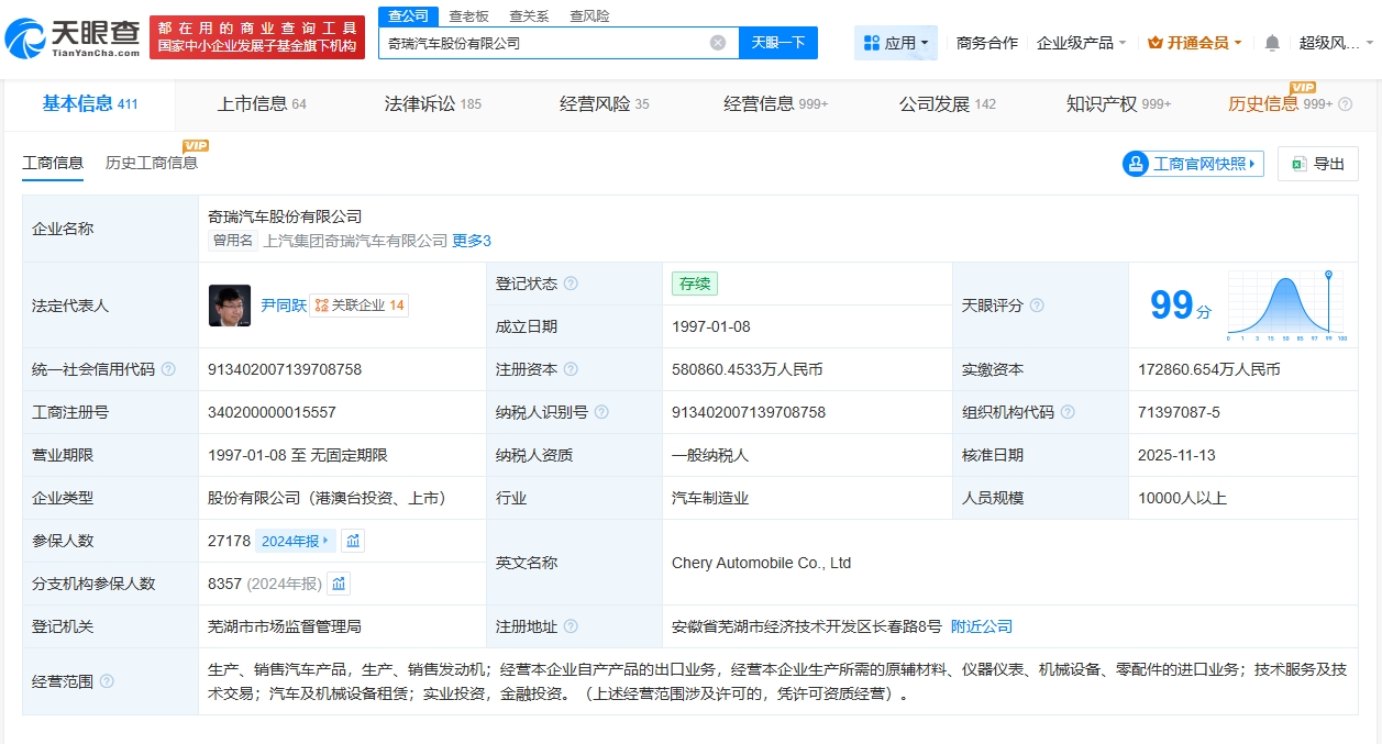 南方财经11月17日电,天眼查App显示,近日,奇瑞汽车股份有限公司发生工商变更,注册资本由约54.7亿人民币增至约58.1亿人民币,增幅约6%。该公司成立于1997年1月,法定代表人为尹同跃,经营范围包括生产、销售汽车产品,生产、销售发动机等。股东信息显示,该公司由芜湖市投资控股集团有限公司、芜湖瑞创投资股份有限公司、安徽省信用融资担保集团有限公司等共同持股。