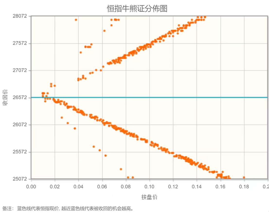 恒生指数在26572点位置,下方牛证密集区靠近中轴,市场减息预期降温,投资者对AI过度投资的焦虑愈甚,本周恒生指数看跌。
