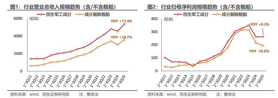 援引民生证券统计数据显示,前三季度民生军工成分(不含舰船领域)实现营业总收入3578亿元,同比增长18.7%;归母净利润193亿元,同比下滑10.0%。若将舰船板块纳入统计范围,则营业总收入达到5346亿元,同比增长17.4%;归母净利润261亿元,同比增长0.3%。