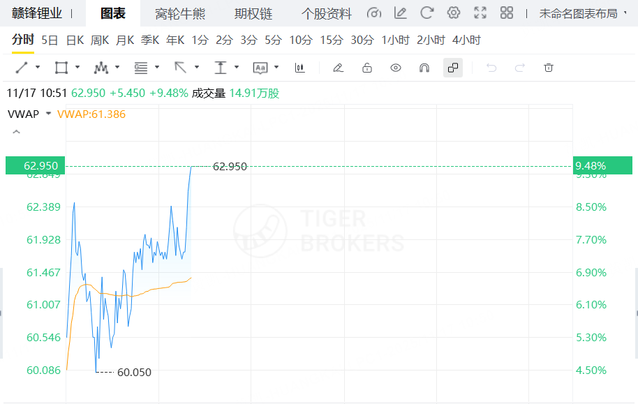 11月17日,锂业股盘中拉升,赣锋锂业涨超9%,天齐锂业涨超7%。