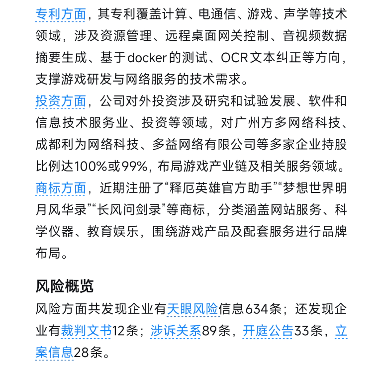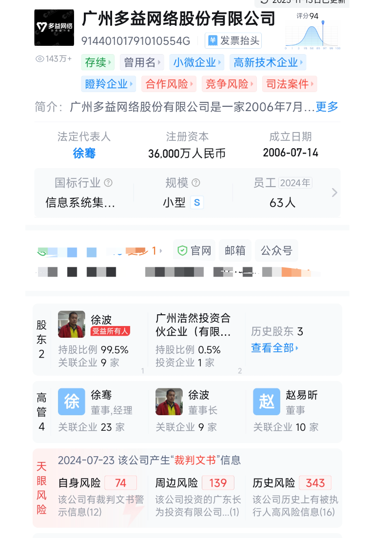 多益网络的企业状况也令人担忧。天眼查数据显示,广州多益网络股份有限公司的参保人数仅为63人,天眼风险信息634条,裁判文书12条,涉诉关系55条。