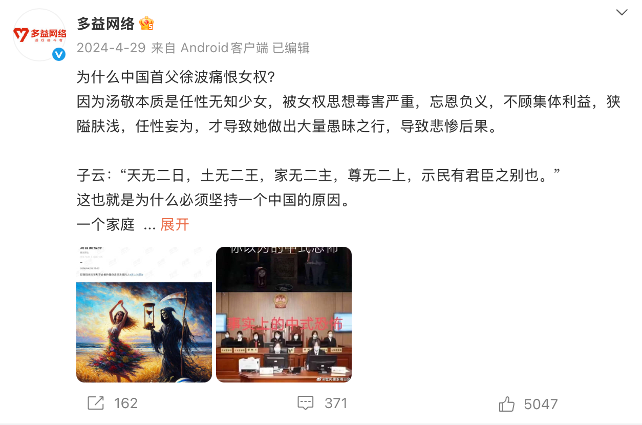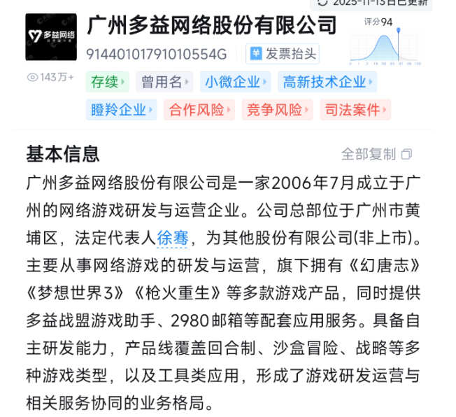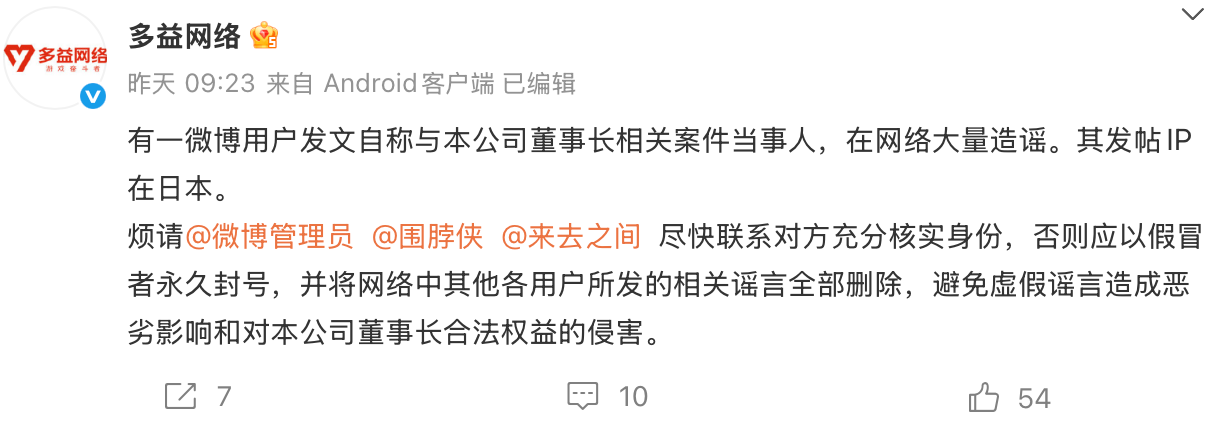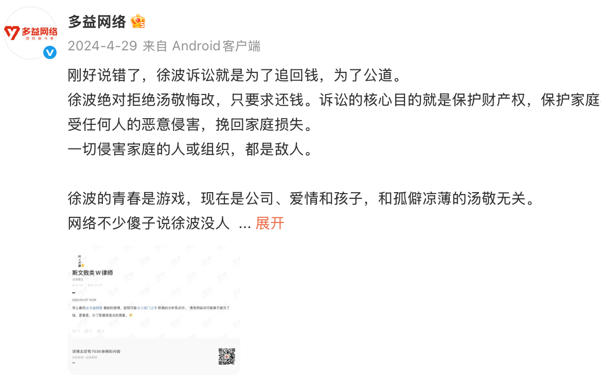 尽管一审已有结果,但纷争远未结束。对此,11月16日,由徐波创办的企业多益网络在社交账号发布正式回应,称相关账号内容为造谣,并要求平台进行处理。