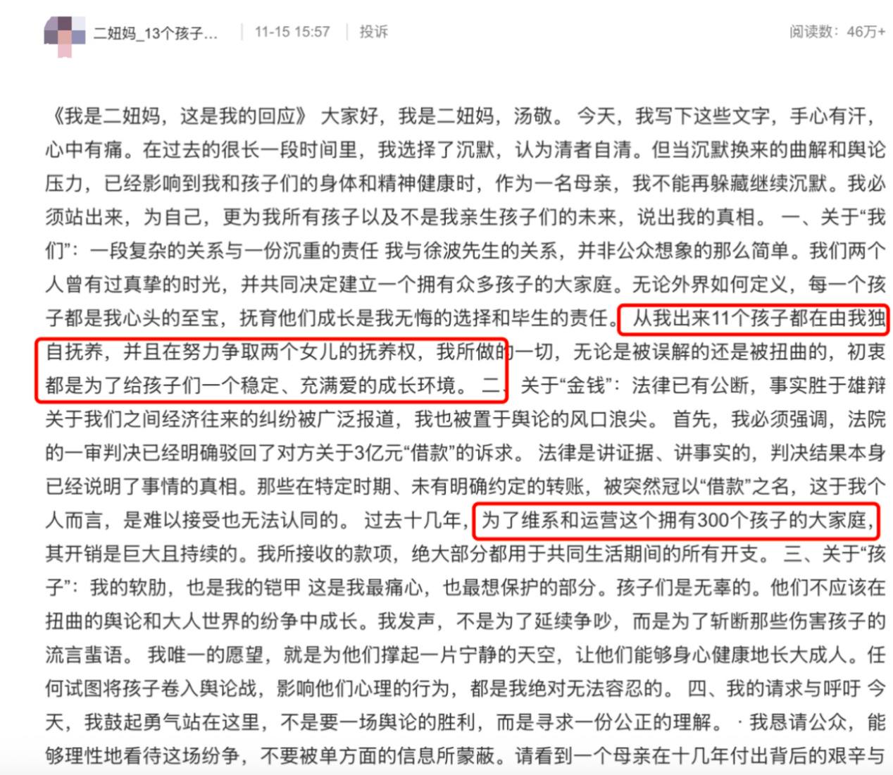 她强调,自己独自抚养着与徐波相关的11个孩子,并正在争取两个女儿的抚养权。她表示,今天鼓起勇气站出来,不是要一场舆论的胜利,而是寻求一份公正的理解。