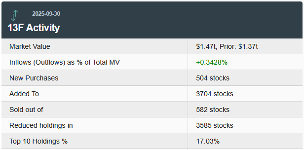 11月17日,根据美国证券交易委员会(SEC)披露,美国银行递交了截至2025年9月30日的第三季度持仓报告(13F)。统计数据显示,美银第三季度持仓总市值达1.47万亿美元,上一季度总市值为1.37万亿美元。美银在第三季度的持仓组合中新增了504只个股,增持了3704只个股。同时,美银减持了3585只个股,清仓了582只个股。其中,美银的前十大持仓标的占总市值的17.03%。