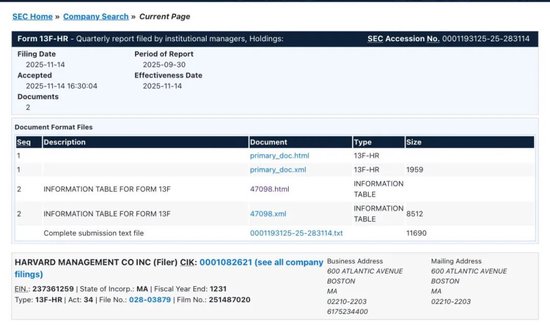 最新披露的 2025 年三季度 13F 文件里,最亮眼的一行出现在“Harvard Management Company Inc.”——也就是哈佛大学捐赠基金的资产管理公司名下: